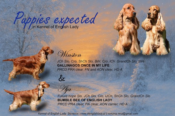 Bumble Bee of English Lady Gallinagos Once in My Life Optigen A, FN clear, AON carrier, HD A Optigen A, AON in FN clear, HD A Mladi up Cro, JCh SLO, CRO, Int JCh, ShCh SLO, Grand Ch JCh SLO, CRO, ShCh SLO, BiH, Grand Ch SLO, BiH, ICh Pričakujemo mladičke zlato rjave barve. Pedigree mladičkov: